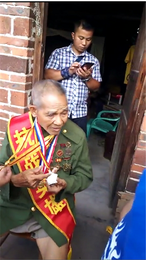 老人介绍自己的军功章