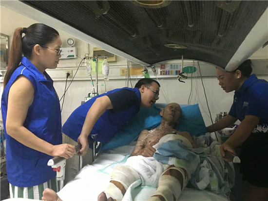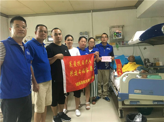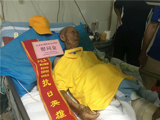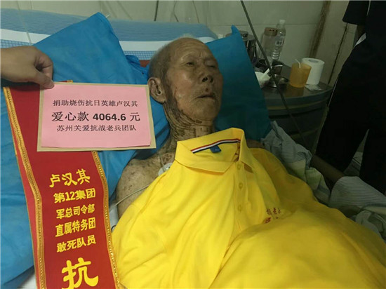 2018年8月12日上午,关爱容县抗日老兵组委会志愿者来到医院探望烧伤住院的广西容县籍98岁抗日老英雄卢汉其,送上纪念抗战胜利73周年的慰问金和慰问品,还有包括苏州关爱抗战老兵志愿者团队在内的社会公益组织、爱心人士的捐款。