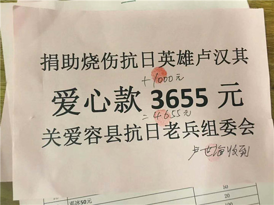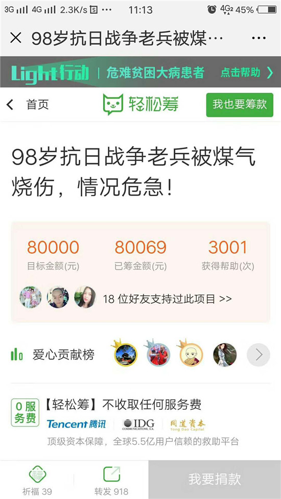 据悉,抗战时期曾加入国民革命军第12集团军总司令部直属特务团,后转入151师,任敢死队员的卢汉其老兵,因为烧伤导致感染严重,8月7日紧急送玉林市第一人民医院就医。微容县公众号前后连发两篇头条新闻报道,玉林晚报连发两篇重要新闻,引起社会各界广泛关注。在轻松筹玉林站的志愿者小梁的帮助下,8月8日,关爱容县抗日老兵组委会、援助抗战老兵玉林行动组、轻松筹的志愿者为卢老紧急编辑,快速审核,以最快的速度发布筹款链接,目标募捐8万元。轻松筹的专业以及所有爱心人士齐心协力的捐助和转发,经过25个小时的努力,截止8月9日11时许,共有3001人为爱捐款80069元。