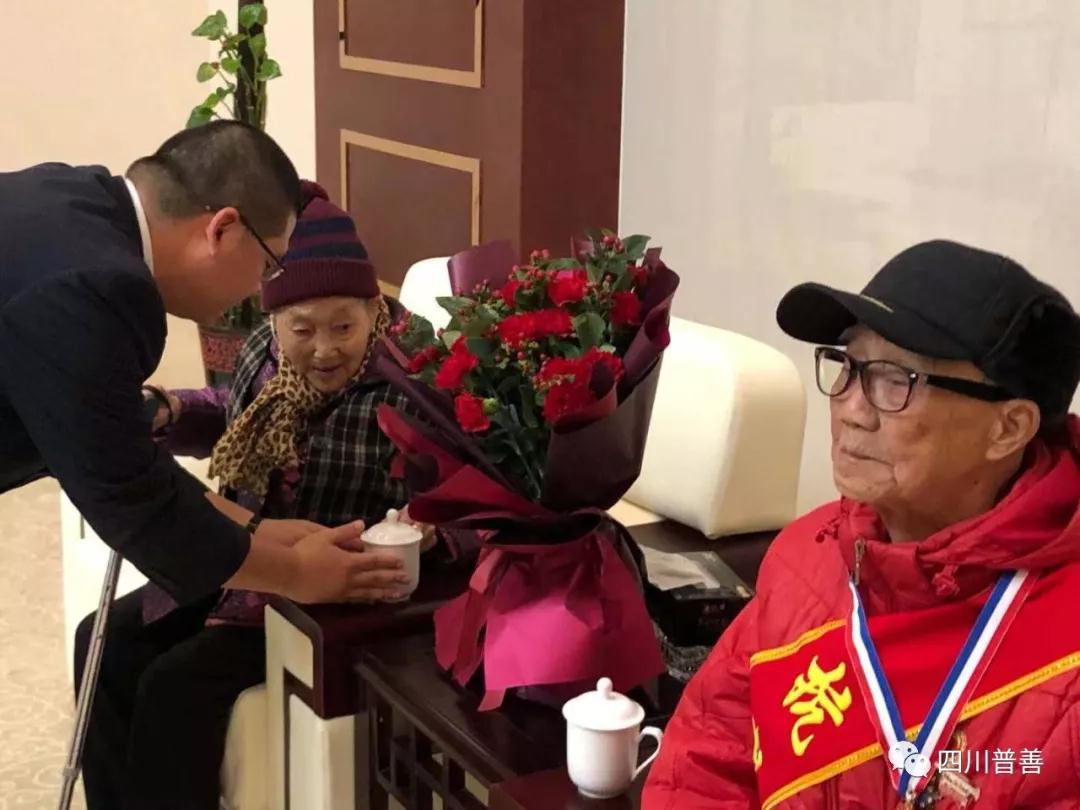 然后刘坤代表四川普善向当地志愿者团队分别赠送了书法作品、锦旗、载有雷佑民抗战经历的《南充抗日老兵口述史》和礼品。