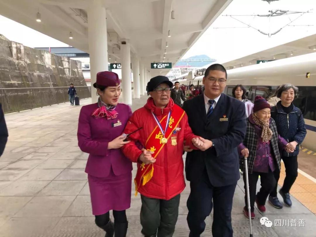 在大家拉起“护送豫籍居川抗战老兵雷佑民荣归故里”的横幅拍下合影照后,两名列车员和几名怡然志愿者搀扶着雷老和夫人登上了G310次和谐号动车。8点零5分,一声汽笛长鸣,火车启动,风驰电掣地奔向雷老的故乡一一河南省信阳市。