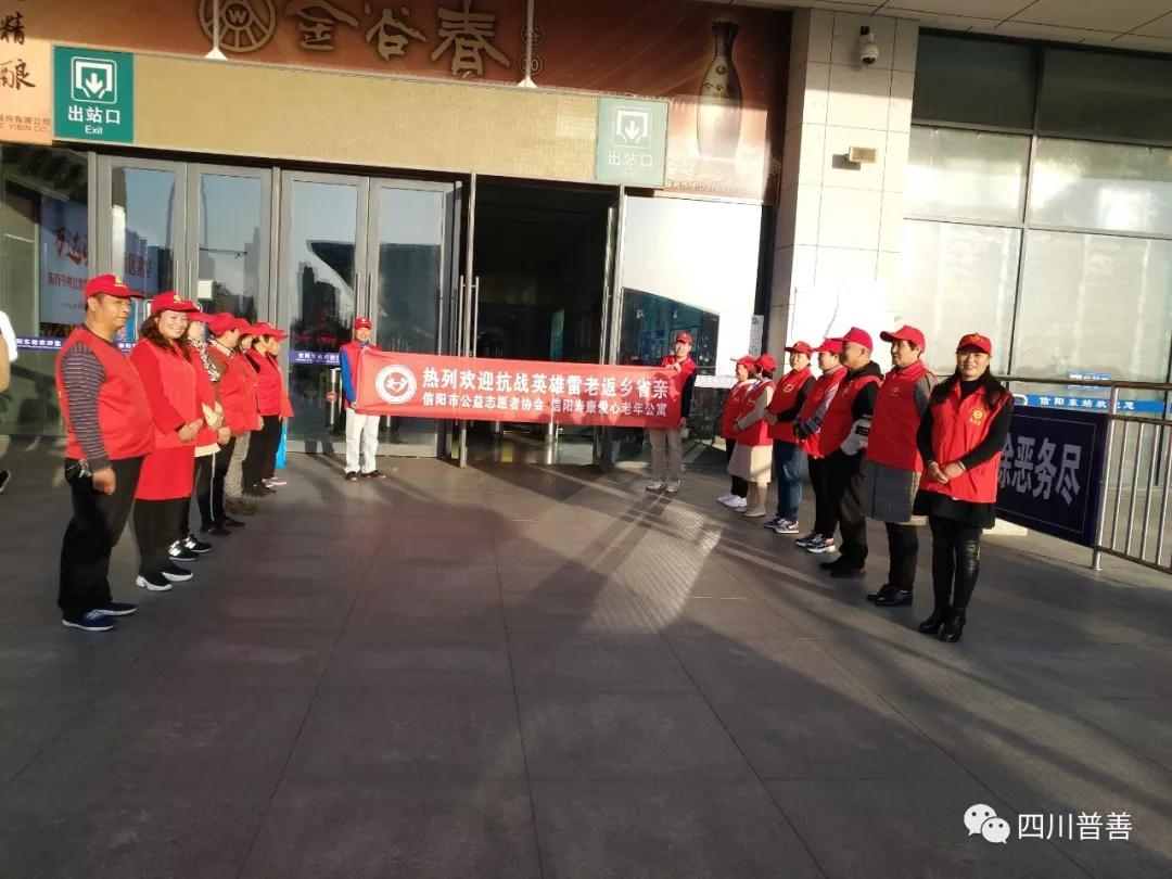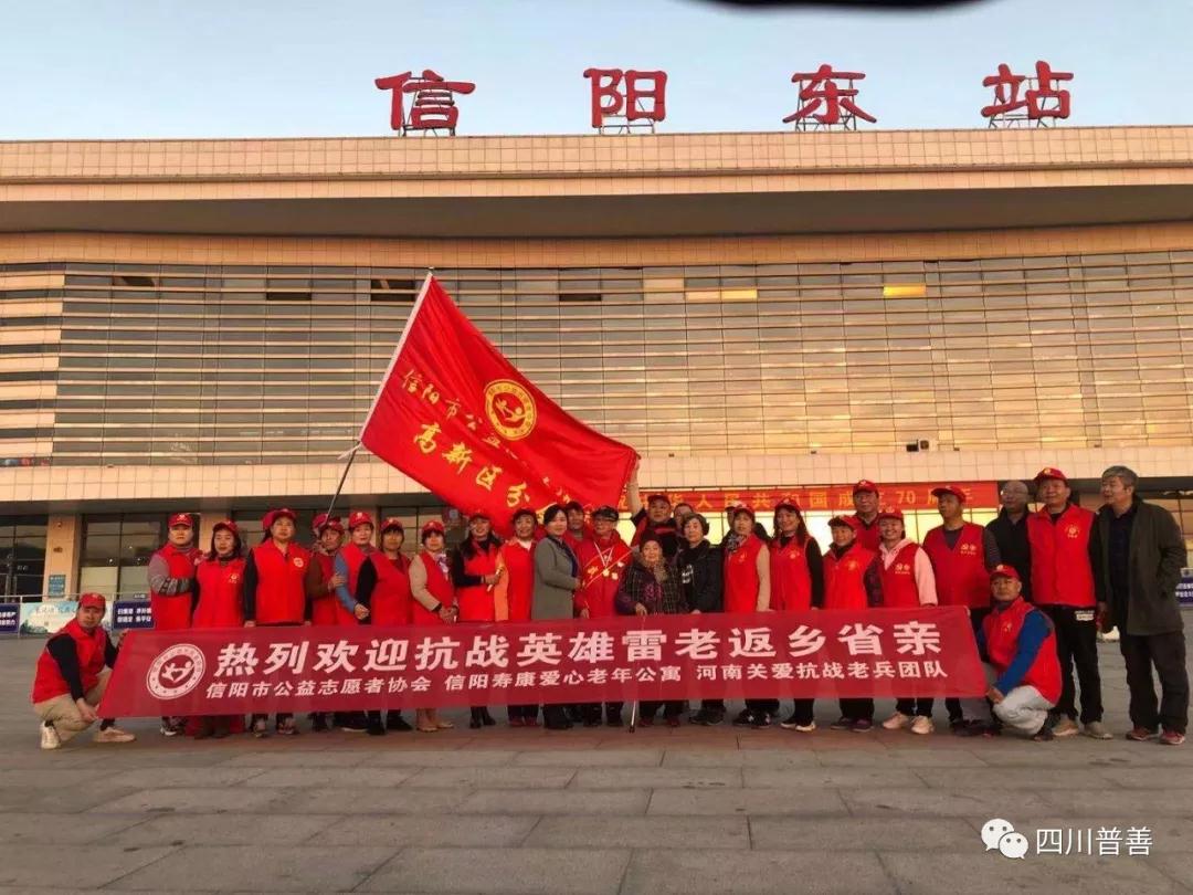 随后大家来到站前广场,参加由河南省关爱抗战老兵团队和信阳市公益志愿者协会、信阳市寿康爱心老年公寓联合举行的欢迎仪式。雷老的亲弟弟和亲妹妹及散居在河南各地的亲人也来到信阳东站迎接分别多年的雷老夫妻。