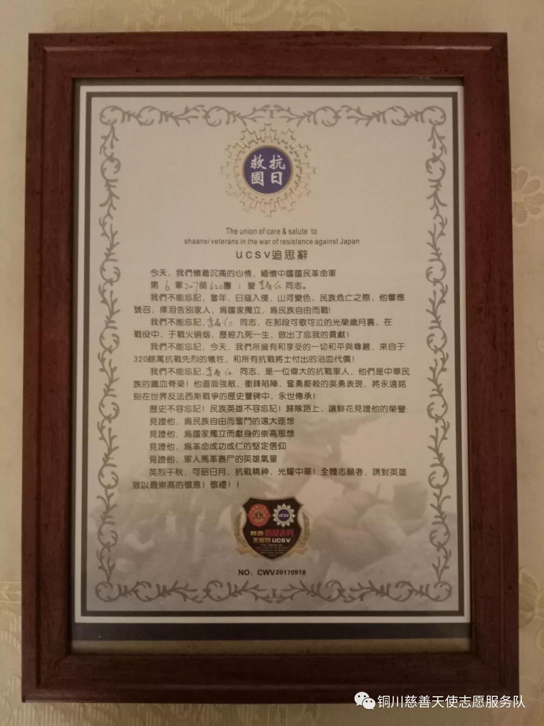 在今天,我们为抗战老兵李寿仁送别,为老兵送去最后的致敬!永远记得你们都是“抗战英雄 民族脊梁”。特此感谢珊珊、水薛丽、一生平安、冷月等志愿者辛勤付出。一次次,铜川志愿者放弃休假走进老兵家中,致敬英雄、崇尚英雄,传承抗战之精神!