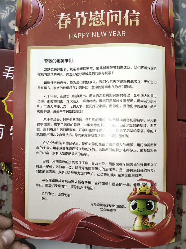 在与抗战老兵郜文秀的交谈中,慰问队伍详细询问了他的身体状况和生活需求,并表示将持续关注老兵的生活,为他提供更多的帮助与支持。看到来自河南老家的慰问信,抗战老兵郜文秀激动不已,忍不住落泪,他感慨地说:“感谢党和政府的关心,感谢老家河南志愿者及社会各界对我的关心,我会永远铭记这段历史,珍惜现在的幸福生活。”