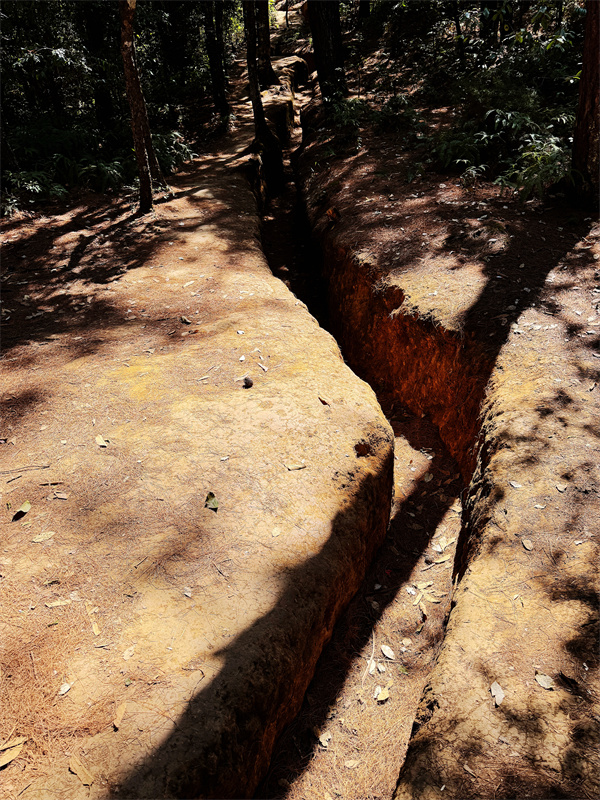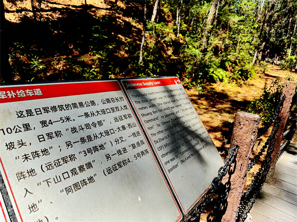 如今,渗透七千多名中国远征军将士鲜血的松山松树茂密、野草茂盛。虽然时间已过去81年,但当年的战壕仍处处可见,由此可以想像当年抗日将士与日寇血战的壮烈场面。山上的一个标牌上有一封远征军英烈的密信复制品,希望有游客破译,然而至今无果!