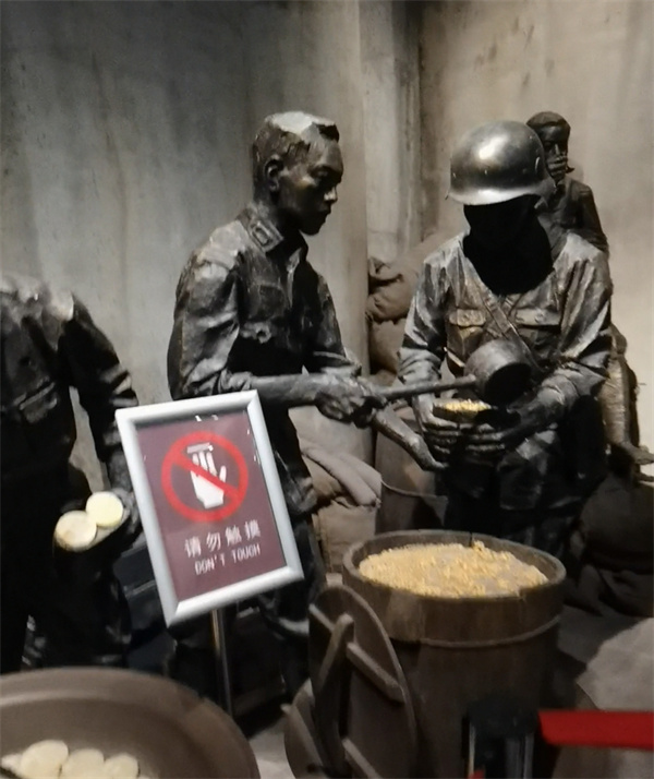 如今八年过去,两位老英雄已归队,和当年的战友们在另一个世界重逢。但他们的身影,却永远留在了苏州河畔,留在四行仓库的台阶前。馆内的灯光有些昏暗,一张张泛黄的照片在展柜里静默:有战士们紧握步枪的坚毅面庞,有被炮火炸毁的仓库一角,有苏州河对岸民众举着标语声援的场景……一组复原场景前围满了人,蜡像还原了“八百壮士”在仓库内休整的画面:有的战士正在包扎伤口,有的在擦拭武器,有的则望着窗外,眼神里是对和平的渴望。