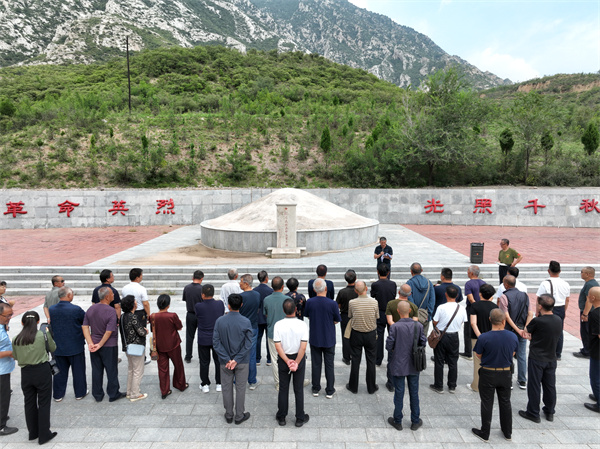 △参加纪念活动的人员在神堂抗日烈士墓前聆听文水党史专家翟吉维讲解文水抗日战争历史和抗日事迹