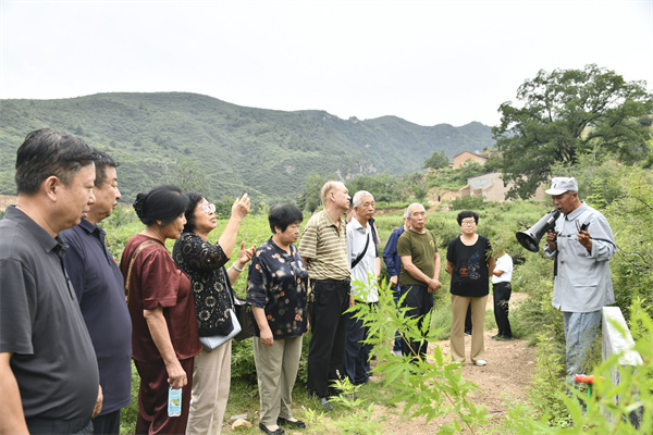 △参加纪念活动的人员在康家堡大槐树下聆听红色后代刘五一讲解文水抗日斗争历史