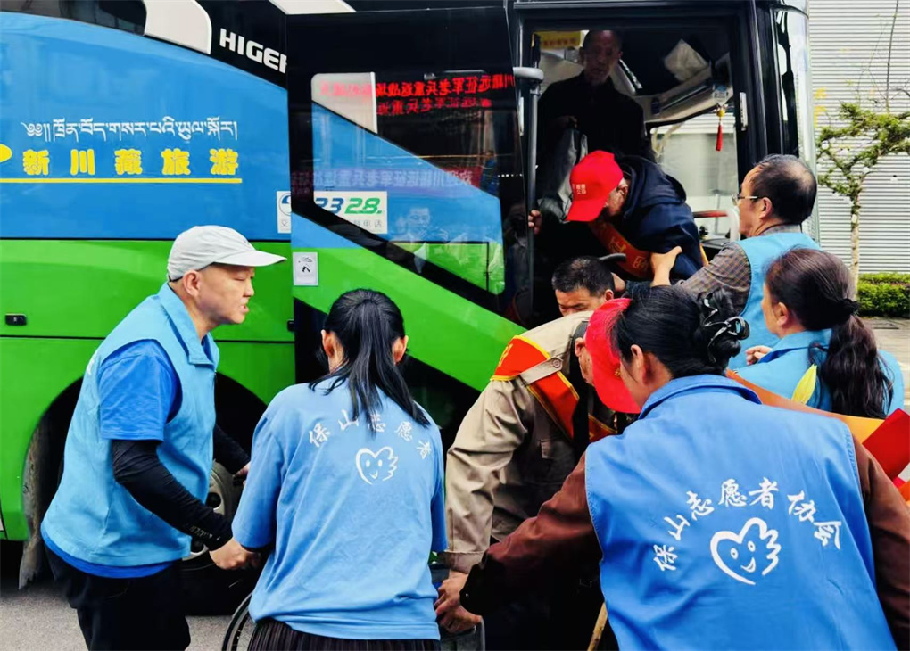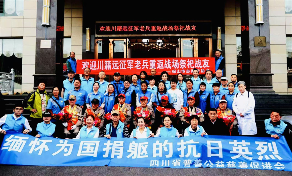 4月2日黄昏,满载“四川远征军老兵扫墓团”一行的大巴车抵达云南保山维也纳大酒店,保山市志愿者协会的志愿者打着横幅、手捧鲜花,热烈欢迎四川远征军老兵一行。他们将鲜花献给每一位老兵,然后搀扶着老兵进入酒店……