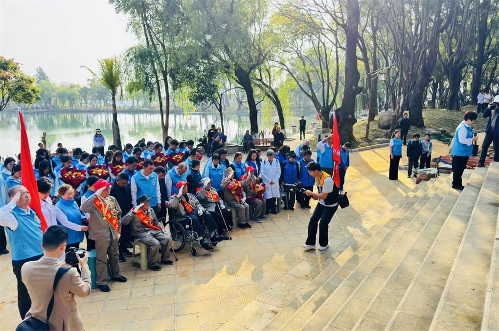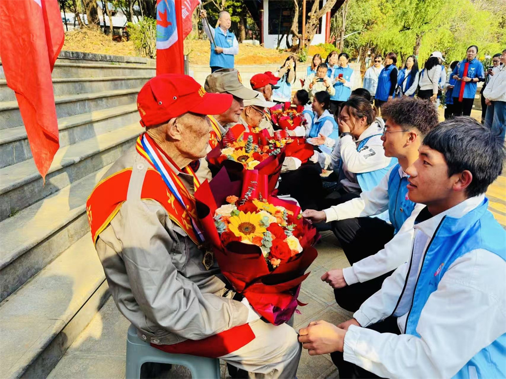 3日上午,四川一行来到保山市易乐池,此地埋葬着三千多具抗日将士遗骸,因此成为“四川远征军老兵扫墓团”必祭之地。是时保山学院60多名学生手捧鲜花,在大门内夹道欢迎远征军老兵,他们齐声高呼;“欢迎老兵爷爷、欢迎老兵爷爷……”,随后在“滇西抗日战争纪念碑”前共同祭奠为国捐躯的抗日英烈。