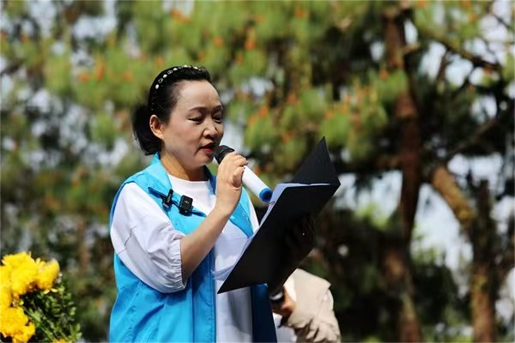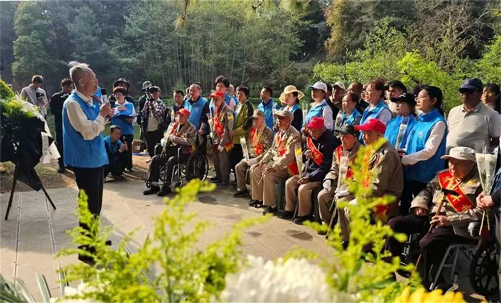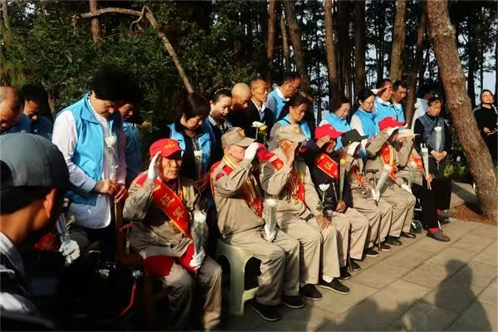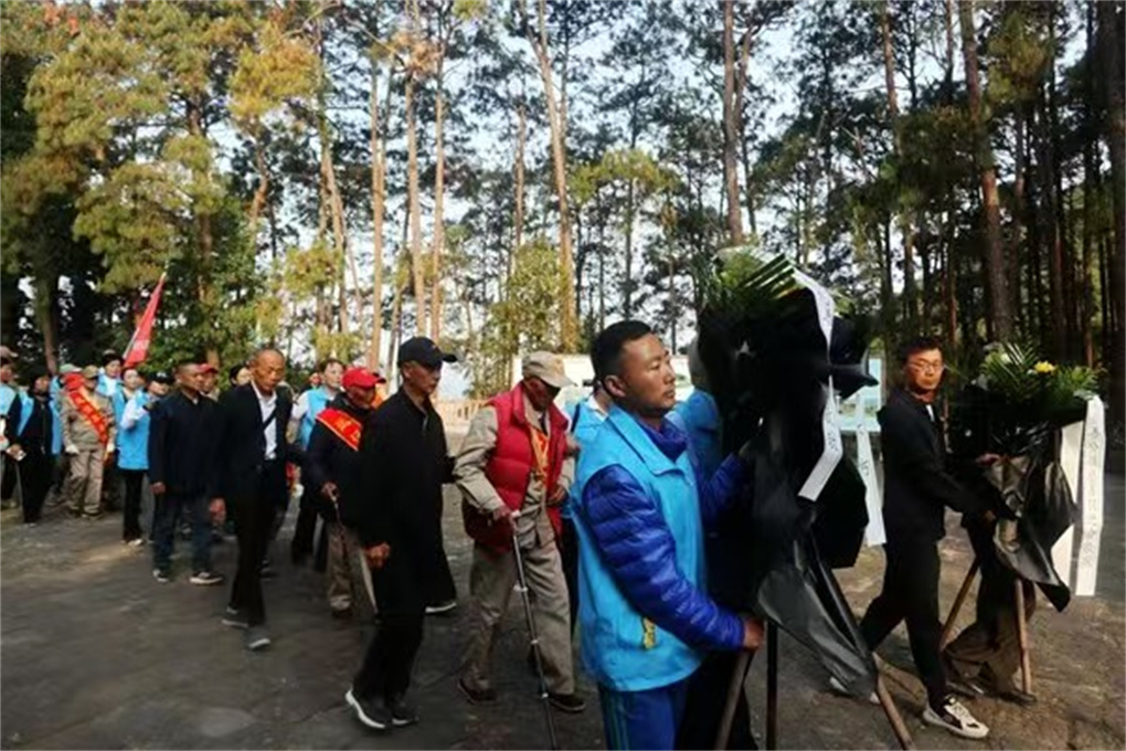 在普善公益志愿者向阵亡将士公墓敬献花篮后,全体参祭人员面对公墓垂首默哀。接着著名雕塑家、松山“中国远征军雕塑群”捐建者李春华老师致辞,他对四川远征军老兵代表以百岁高寿、不远千里来到松山祭奠抗日英烈表示欢迎,并向大家介绍了新落成的“松山春华雕塑园”的建设情况;普善志愿者朱兴弟则简要介绍了李春华老师当年设计“中国远征军雕塑群”的初衷和意义,并自费建设、无偿捐赠的善举,他对李老师的远见卓识和无私奉献表示衷心的感谢。