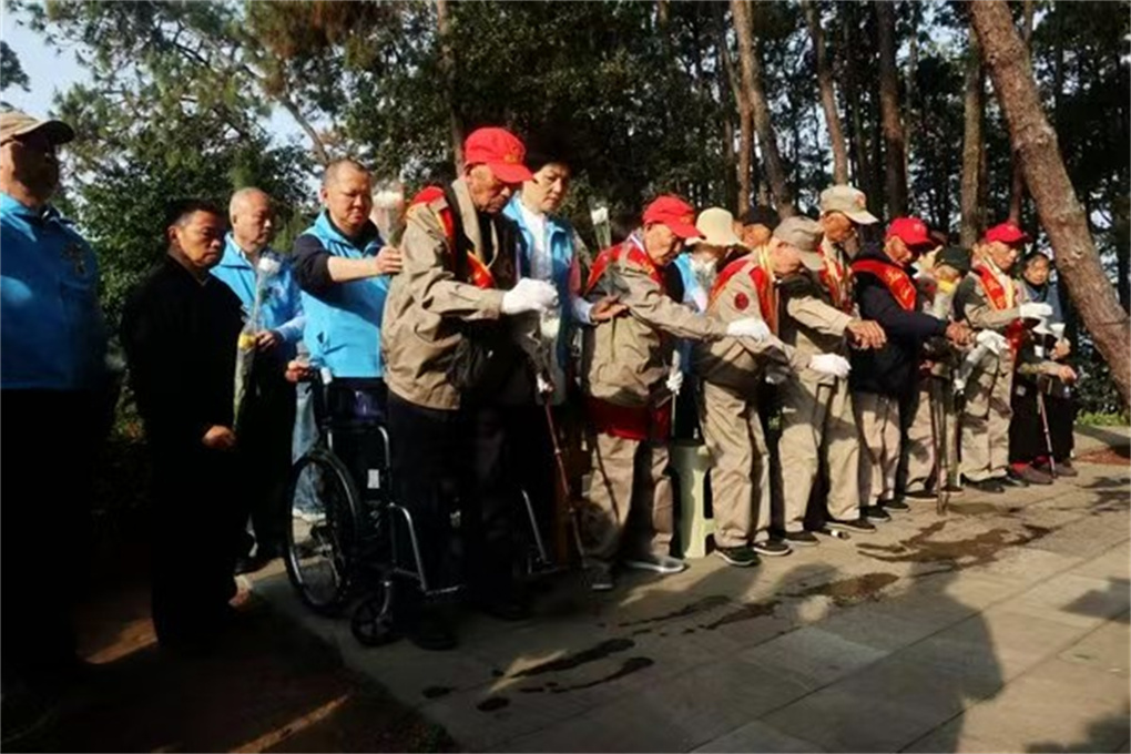 4月4日上午,四川“中国远征军老兵扫墓团”一行来到举世闻名的龙陵松山抗日战场遗址,大巴车刚刚停下,102岁老兵廖沛林就迎了上来。