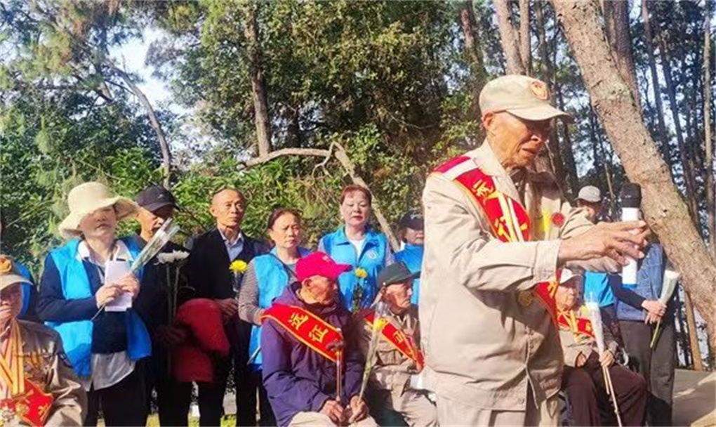 祭奠仪式上,廖沛林代表中国远征军老兵、王大憨代表湖南志愿者、刘宏涛代表普善志愿者、刘坤代表远征军后人先后发言。来自南充的胡萍声情并茂地朗诵了朱兴弟创作的诗歌《松山祭》,结尾段写道:“远征军将士犹如群星从碑文间升起,他们再未抵达心中的故乡。当白发老兵与塑像对视,整座松山开始轻轻摇晃!中国远征军的功勋有多大?我们以松针的密度默默丈量。为国捐躯的抗日将士从未离去,他们变成雄鹰在天空永远翱翔!”。