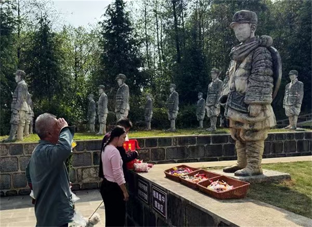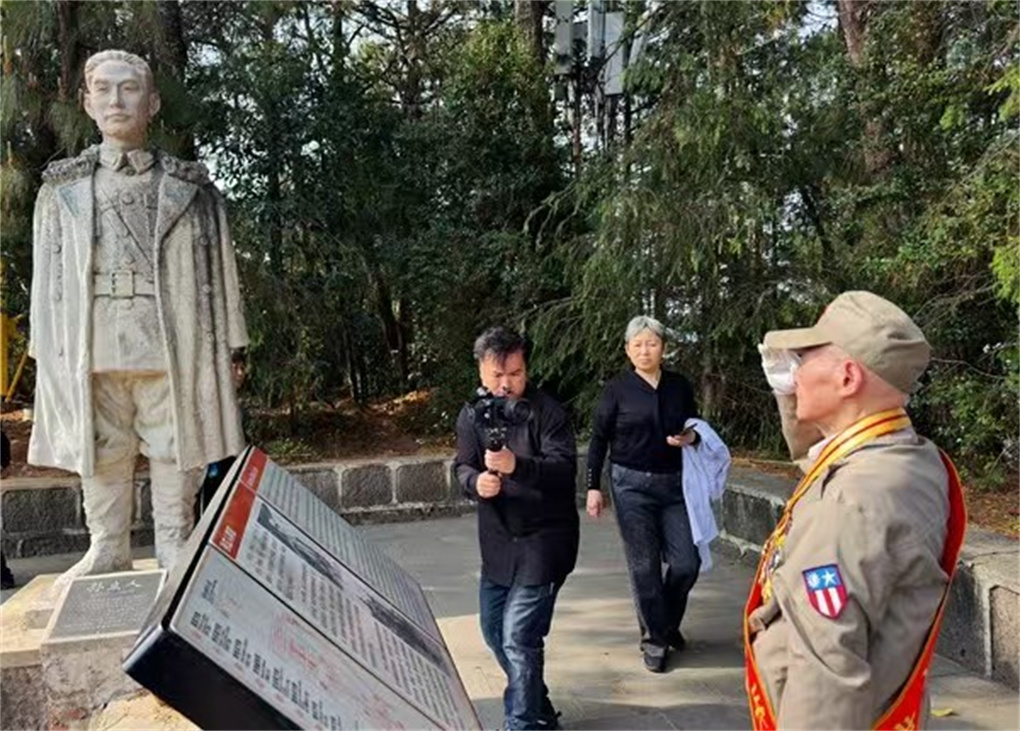 祭奠仪式结束后,几名远征军老兵在志愿者的搀扶下,登上几百级石梯,来到松山广场。气势恢宏的中国远征军雕塑群出现在大家眼前。老兵们分散在将军和战士雕塑方阵中,认真察看每尊塑像前的铭牌,寻找当年的长官和战友,一旦找到便凝视良久,并合影留念。喻志永老兵面对持枪战士塑像轻声说道:“战友,我们来看你了……”原新一军新38师老兵曹泽富则举手向当年的长官孙立人将军敬军礼,久久不愿离去。