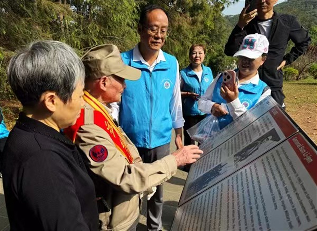 在纪念馆广场一侧有一座日军当年修筑的非常牢固的钢筋混凝土六边形碉堡。碉堡四周张着大口的射击孔和它周身密码密麻麻的弹孔,似乎在人们讲述当年战争的惨烈和悲壮。在纪念馆里面,滇西抗战时期的历史图片、地图、中日两国军队的武器装备、仿制的工事及地堡等实物实景琳琅满目、布满展馆,因此勾起了曹泽富老兵对80多年前的回忆,他仿佛又回到了战火纷飞的岁月,想起了曾和自己并肩抗击日寇的战友。他说,当年中国军人与日寇浴血奋战,付出了重大牺牲才换来我们今天的和平安宁。因此,我们要牢记历史、勿忘先烈,珍惜今天来之不易的幸福生活。在场的志愿者受到了一次十分难得的中国远征军抗战史教育。