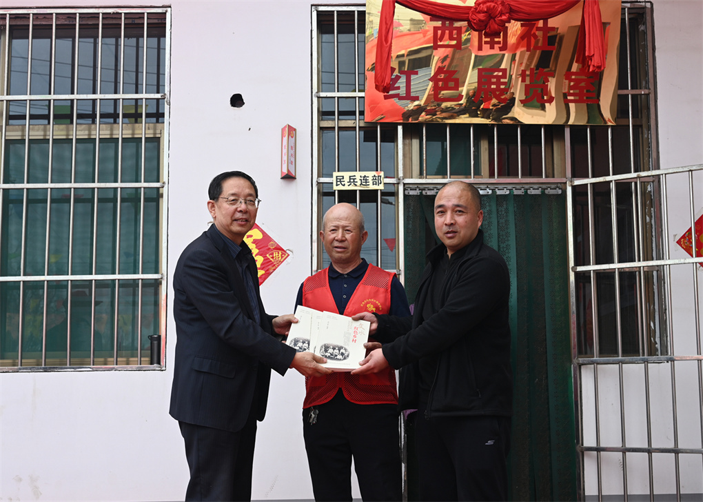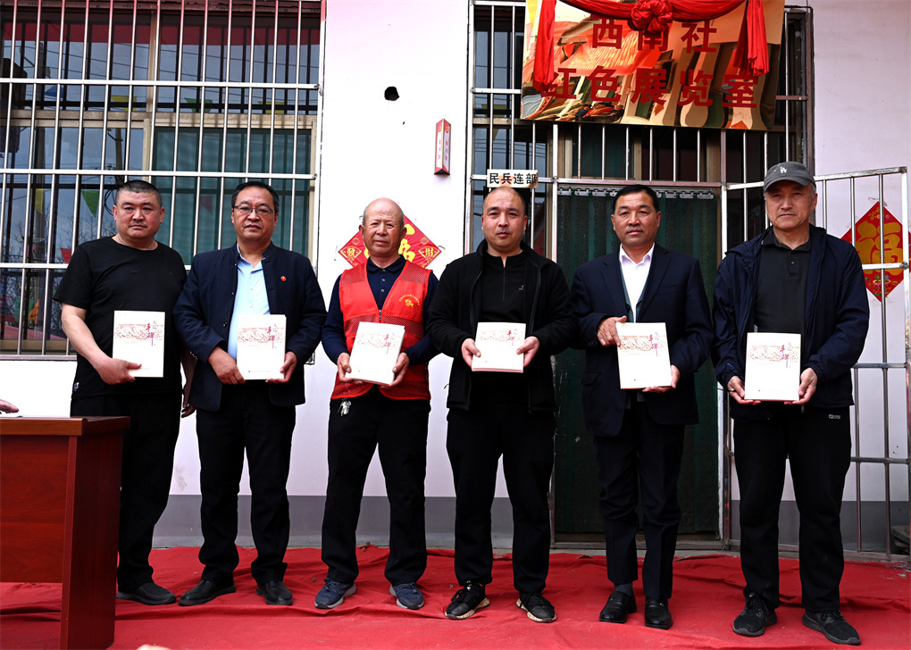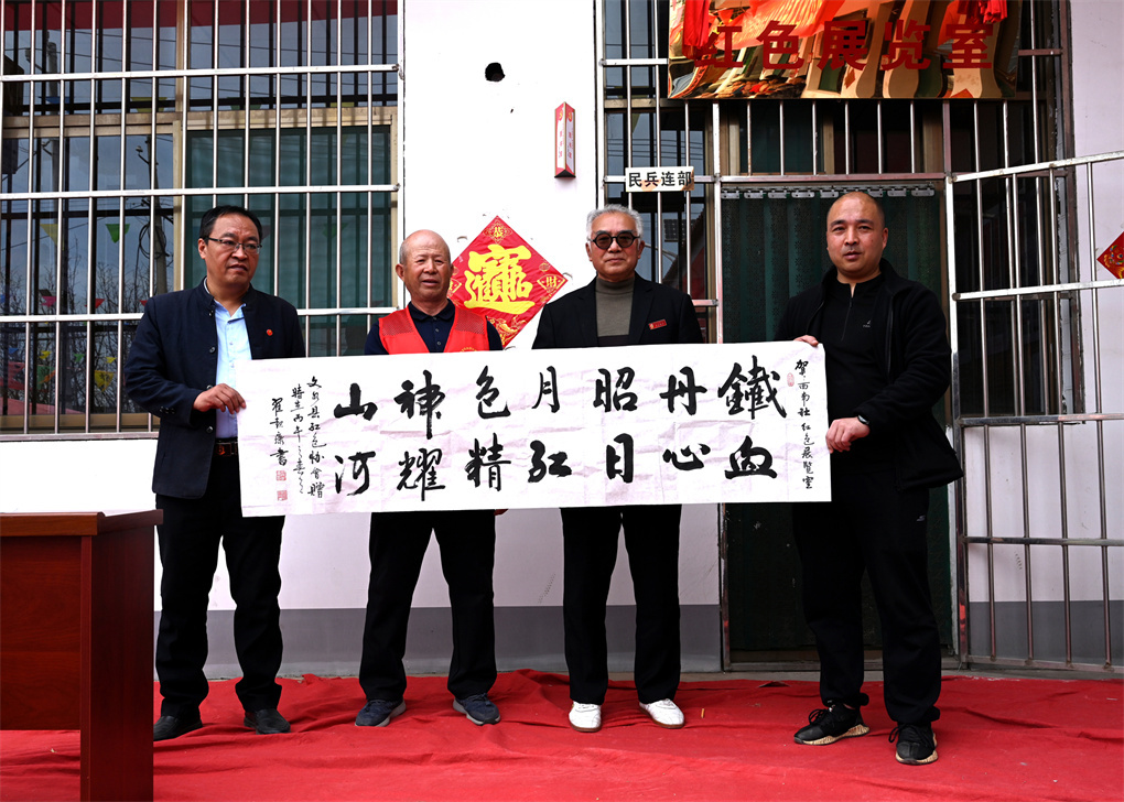 在激昂的锣鼓与鞭炮声中,张小虎会长与冀志强书记共同为红色展览室揭牌。仪式现场,多位嘉宾慷慨赠礼,为展馆注入丰富文化资源:梁大智赠送个人编著的《乡村记忆》《红色乡村》;刘五一赠送红色著作《鲜血染红的旗帜》;协会代表赠送编印的红色书籍《丰碑》;书画家翟起康、康勇分别赠送红色主题书法与乡土国画作品。