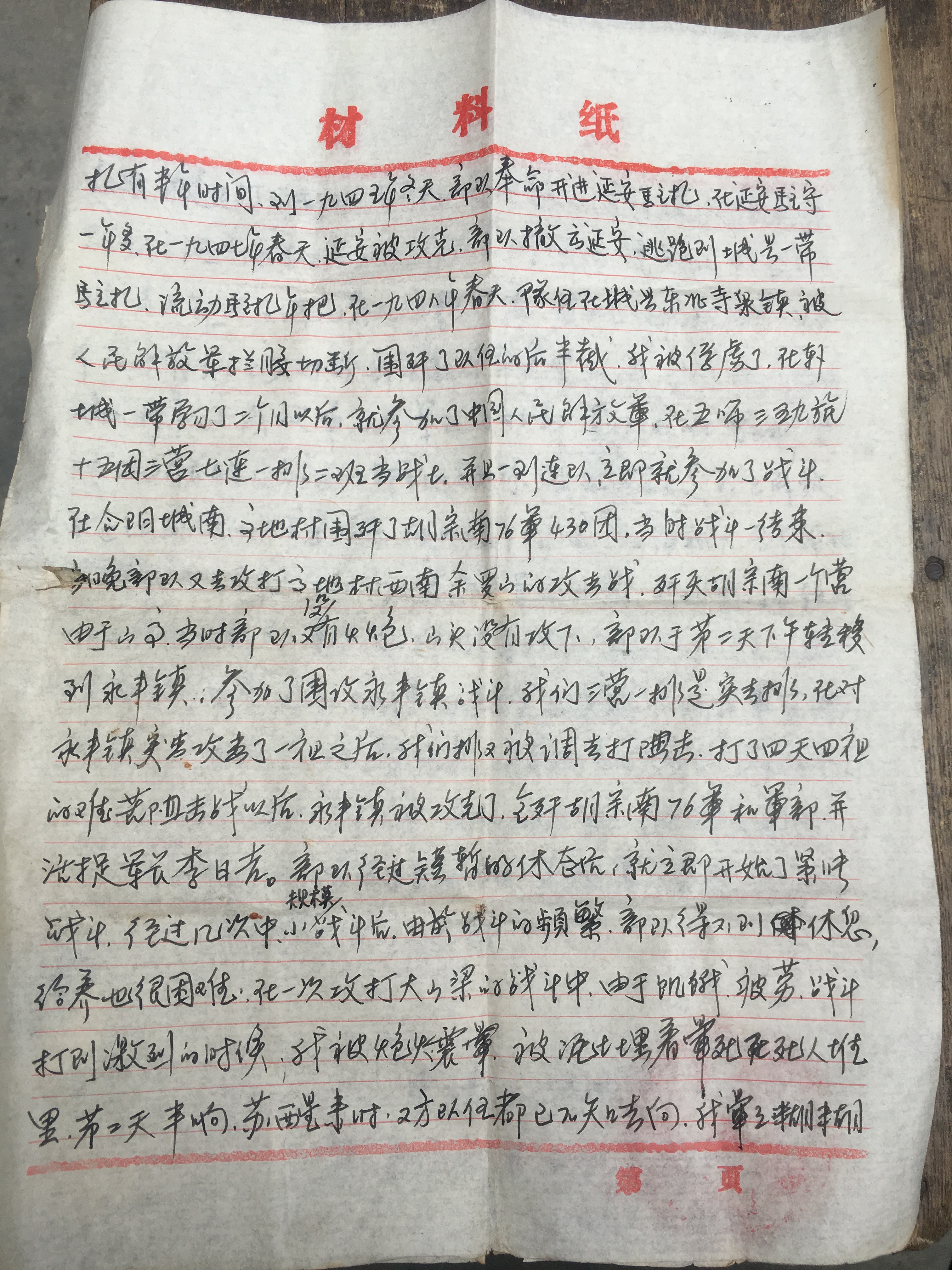 到一九四五(应1946)年冬天, 部队奉命开进延安驻扎,在延安驻守一年多,在一九四七(应1948)年春天,延安被攻克,部队撤出延安,逃跑到城县一带驻扎、流动。驻扎年把,在一九四八(应为1949)年春天,部队在城外东北寺 镇,被人民解放军拦腰切断,围歼了部队的后半截,我被俘虏了。在韩城一带学习了二个月后,就参加了中国人民解放军,在五师三五九旅十五团三营七连一排二班当战士,并且一到连队,立即就参加了战斗,在合阳城南高地村围围歼了胡宗南76军430团。战斗一结束,当晚部队又攻打了高地村西南余罗山的攻击战,歼灭胡宗南一个营。由于山高,当时部队又没有火炮,山头没有攻下。部队于第二天下午转移到永丰镇,参加了围攻永丰镇战斗,我们三营一排是突击排。在对永丰镇突击攻击了一夜之后,我们排又被调走打阻击。打了四天四夜的阻击战以后,永丰镇被攻克了,全歼胡宗南76军和军部,并活捉军长李日喜。部队经过短暂的休整后,就立即开始了紧张战斗。经过几次中、小规模战斗后,由于战斗的频繁,部队得不到休息,给养也很困难,在一次攻打大山梁的战斗中,由于饥饿、疲劳,战斗打到激烈的时候,我被炮火震晕,被泥土埋在死人堆里。第二天半响苏醒来时,双方部队都已不知去向。我晕晕乎乎起来,边走边打听部队,可部队越走越远……这时是1949()年夏天,我只得住河南家乡的方向走回。在走到陕西,潼关城东门外,又被一支不知名的国民党 队伍拦着,硬补在他们队伍里。在这个部队有六、七天时间,部队就宣布武装起义了。起义以后,我被编入中国人民解放军西北军,后勤部兼(?)护团,在警卫排当战士(团长姓王,名字忘了)。我们这支部队主要任务是护卫解放区运往前线 的战争物质,所以很少打仗。在49年秋天,整个华北华中都已经解放,我们部队奉命驻军大西南。我们团又被转为西南军区后勤部警护团,我们在警护卫团 排当战士。以后又在团部当通讯员,参加了西南地区 抄匪反霸、土地改革第一系列的战斗。直到1952年复员回家,回家后参加农业生产劳动至今。