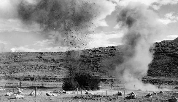 望哨报告,东南上空来了两架飞机,注意!话未说完,敌机到了,往阵地上投弹,没有炸到什么。四枚弹丢完,就靠机枪扫射,对我们来说也是习惯了的。炸弹过后炮火又紧起来,原来鬼子从北边开阔地上散开来了。在大炮和重机枪的掩护下,他们头戴钢盔,手持步枪,刺刀在朝阳中闪闪发出寒光,脚穿皮靴,好像小黄狗,向前跑几步,趴一次。看最前面一个,手执月亮旗,向坟头上插。200米、150米,逼近到百米左右了。一排长袁大麻子,从射击孔里看见此景,红了眼实在也忍不住了,一声“兔崽子,去见鬼吧!”呯!插旗子的小鬼子翻了下去见他的天皇了。