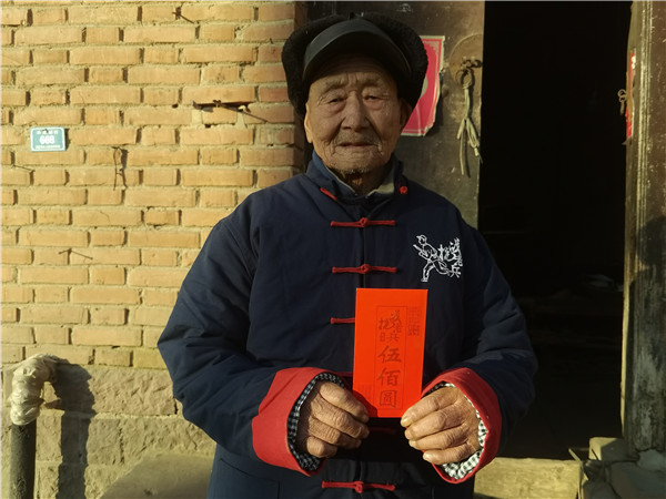 首先来到郏县高楼村102岁抗战老兵高太山家,高老看到志愿者三乐就激动的说“没想到还能见你,我身体不行了呀,才出院,老了,毛病都出来了。”三乐、龙哥安慰高老说:“您身体棒没事,多吃点饭增强免疫力,好了继续为乡亲们看病。今天给您送来南京民间抗日战争博物馆、思源爱民公益基金赠送给您的棉衣和慰问金,我们给您老换上棉衣”。老兵换上棉衣,手拿致敬金,凝视着左胸前,读出“抗日战争老兵”字音后,激动的说“谢谢大家伙儿没有忘记我抗日了,请接受抗战老兵高太山的敬礼!谢谢你们!”说着,鲐背之年的高老给志愿者敬了一个标准的军礼!这就是我们的抗战老兵,用最质朴的方式,以最庄严的敬礼,向捐助者和帮助他的人们表达最崇高的致谢!此刻,让在场的志愿者无不感动。