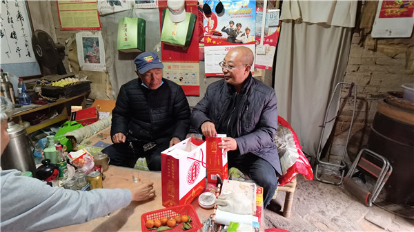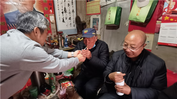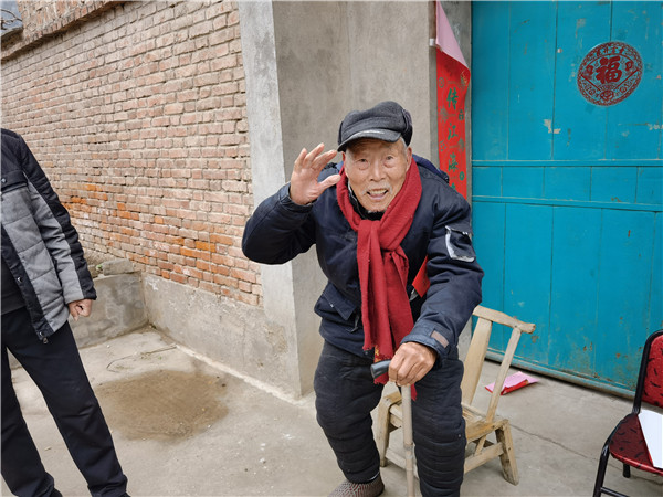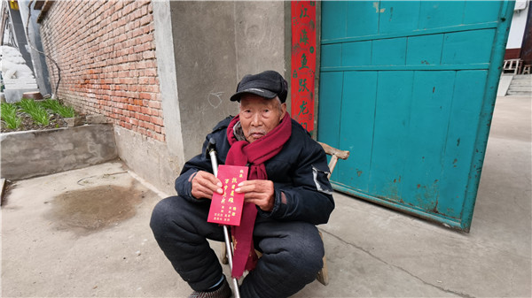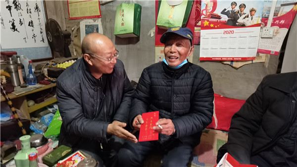 首先来到章化乡岭张村看望98岁抗战老兵张见钦老人。老人身体还行,精神状态很好,拄着拐杖在大门口迎接大家,三乐问:“你是哪个部队的还记得吗?长官叫啥名字?”张老回答:“我是十三军第四师12团三营机枪连。我知道我的营长叫文蔚然。”三乐说:“我有你营长后人的电话,给你连上视频你们说说话。”现场与湖南的营长文蔚然后人视频,三乐对视频那端介绍说,这位是你爷爷的部下。视频那端:张爷爷您好,我是您的晚辈,您身体好吗?张老对着视频点头致谢,连声说:“好,好,好”视频结束,老营长后人当即发500红包给三乐让其代交给老兵,表达晚辈孝敬之意,老兵感动地手捧礼金喃喃自语“没想到,没想到,老营长的后代……”。紫藤代表爱心人士为老兵送上致敬红包。