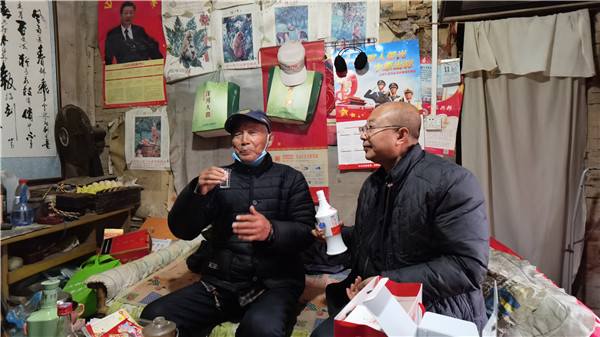 暂别老人,志愿者一行驱车来到北舞渡镇田李村看望抗战老兵李龙现老人。大家来到李老门口,看到大门上锁,三乐与老兵电话接通原来老人在附近打麻将,说马上回来。一会儿大家看到李老快步流星急匆匆的样子,龙哥迎了上去:”您老慢点!慢点!”大家到屋里坐定,三乐说:“李老你看我给你带的啥?平坝酒,是不是每天都要喝上几杯?”“喝呀!每天都喝,不过也喝不多了,就是三四两”。为了让老兵高兴,龙哥打开平坝酒陪老人喝酒与老兵碰杯,老兵很开心。志愿者紫藤把爱心人士为老兵敬奉的红包递给李老,老人又激动又兴奋为大家唱起京剧《甘露寺》选段来。李老1930年生,12岁在宝鸡第一军七十八师胜利剧团参军,因为年龄小,当兵就是文艺兵。每次见到李老,他都会为大家唱一段京剧。