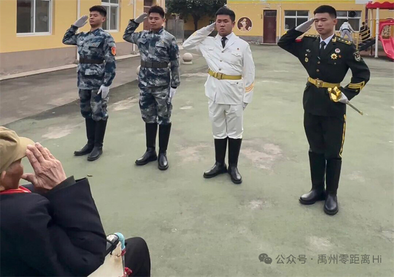 看望现场,禹州市大学生仪仗队身着整齐服装,迈着铿锵步伐列队而立。随着一声响亮的口令,队员们抬手敬礼,标准的军礼中满是对老兵的敬仰;葛二祥老人坐在轮椅上,目光坚定,缓缓抬手回礼,动作虽略显迟缓,却饱含着军人的荣光与岁月的厚重。这一敬一回之间,是跨越时空的精神传承,是老一辈革命者与青年一代的心灵共鸣,在场所有人都为之动容。