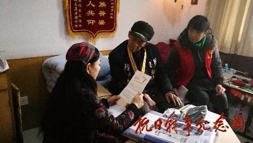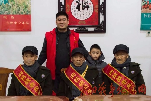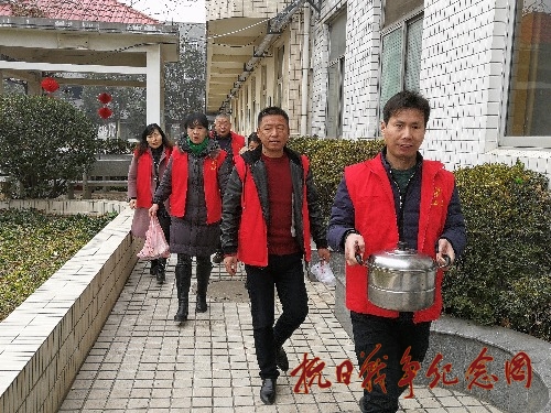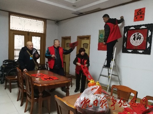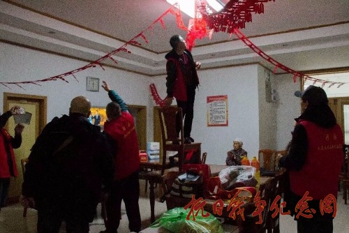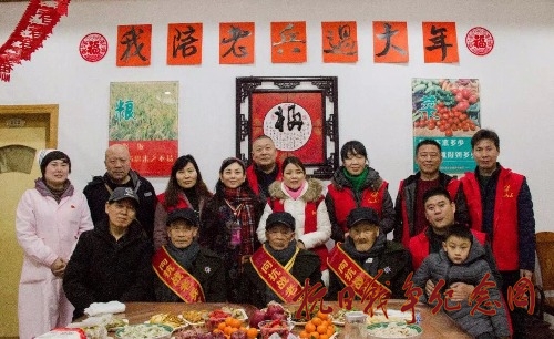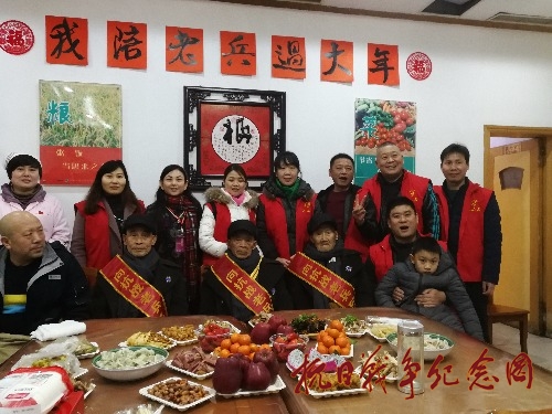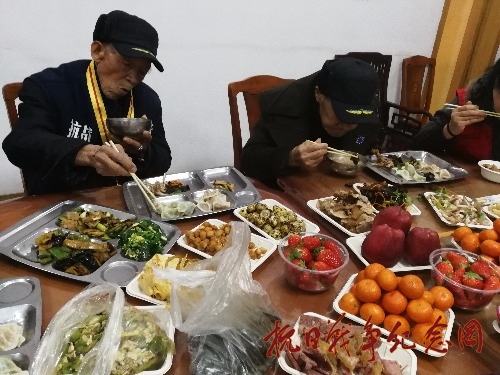 2018年2月18日上午,志愿者们放弃新年家人团聚的机会,满怀喜悦的心情,分乘多路专车来到夕阳红老年公寓大门口,然后兵分两组,一组有包容、陈静、一生携带食材到志愿者包容的哥哥家,为大家做饭菜;一组直接到老年公寓装点布置陪伴餐厅。3号公寓的孙永清、王国颜老兵听到志愿者们过来陪同过年,看到大家爬高上低张灯结彩,非常高兴。在二楼居住的朱锡瀛老兵闻讯,满面喜悦,稳步走下楼梯意欲帮忙,被志愿者扶坐在椅子上。大家一边装点布置一边摆放水果与糕点。十二点整,炊事组饭菜已做好,热乎乎香喷喷的饭菜,新鲜凉菜拼盘与多样水果摆满桌面。此刻“我陪老兵过大年”活动开始,志愿者们将龙越慈善基金会敬送的三个暖冬大礼包打开,把大衣、围巾、纪念章分别为老人穿戴好,与老兵合影拍照,志愿者代表沧海简单致辞:“今天是大年初三,市区“我陪老兵过大年”活动,在老年公寓进行。抗战老兵是民族的英雄,国家的财富,关爱他们就是传承孝道文化,弘扬爱国主义精神。为实现‘老兵快乐俺心甜,志愿服务非等闲,兄弟姐妹不谦让,关爱陪伴都争先’的陪伴氛围,达到‘孤寡老人不孤单,抗日战士幸福舔,张灯结彩好喜庆,老人健康乐平安’的陪伴宗旨,今天各位志愿者携带饭菜与暖冬大礼包,来到老年公寓。给老人以关怀,送老人以温暖,听老兵讲故事,与老兵共进餐,同老人共欢乐,陪老兵过大年。我提议为老兵健康长寿举杯!”