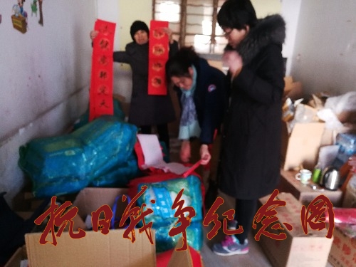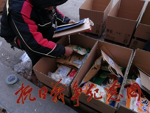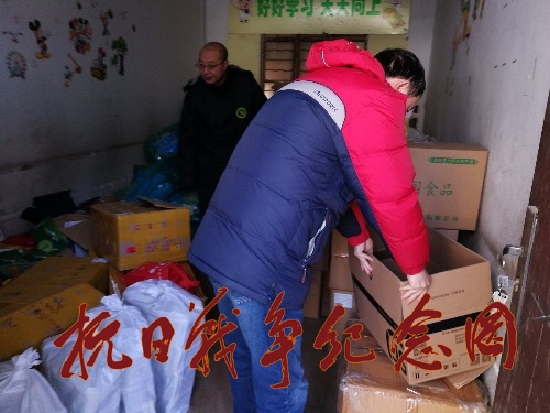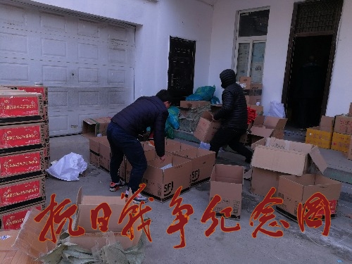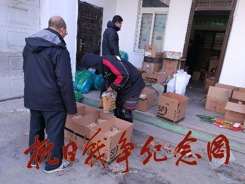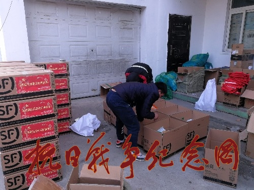 图片为河南平顶山团队志愿者配合顺丰快递公司,正在为豫籍全国抗战老兵节日礼品整合装箱。
