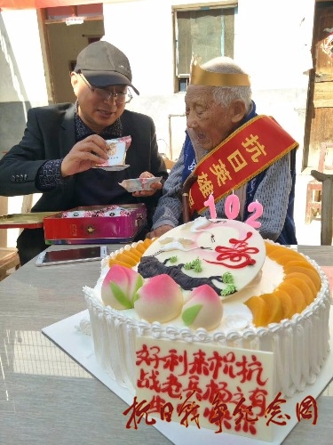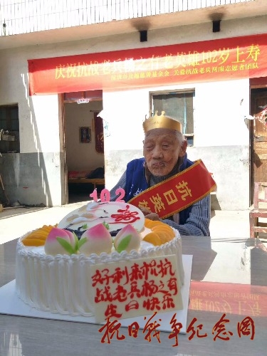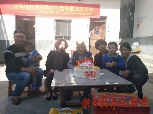 2018年10月30日是抗战老兵杨之有102寿诞的喜庆日子。平顶山志愿者张春峰、苹果王、一生有你、无序、龙哥等一行驾车近百公里来到鲁山县赵村乡,与家人一同为抗战老兵杨之有老人过期颐寿诞!庆贺抗战老兵杨之有老人102岁生日!