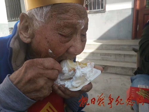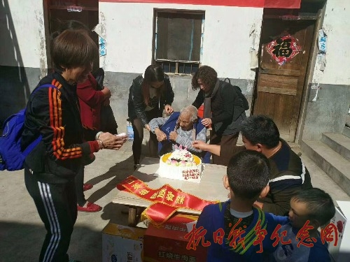 近年来杨老由其43岁的孙媳妇薛换细心照顾。生活、饮食很有规律,天气好的时候,他还会到室外转一转,晒晒太阳。杨老耳朵不太灵光,看到志愿者带着礼品和生日蛋糕来到家里为他过寿,高兴的心情无以言表,忙招呼大家坐下。因杨老的家住在大山深处——尧山下汤镇,到杨老家里已经中午12点了,大家立即忙活起来,有的张贴横幅,有的为老寿星更换服装,有的为老人披戴绶带,有的准备庆贺场地,准备完毕后让老寿星正位寿椅坐定。老寿星一番打扮有看上去红光满面,很是精神。仪式开始,龙越慈善基金会致敬红包送上,平顶山志愿者代表云南团队周大姐为老兵送上生日鲜花饼;代表浙江乐公益协会敬送抗战老兵纪念衣物,打开好利来生日蛋糕 ,点上生日蜡烛,同家人共唱生日歌,祝福老兵福如东海寿比南山 健康吉祥幸福平安!