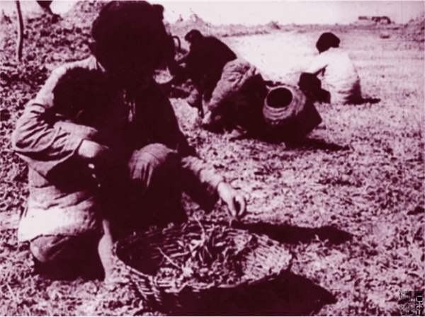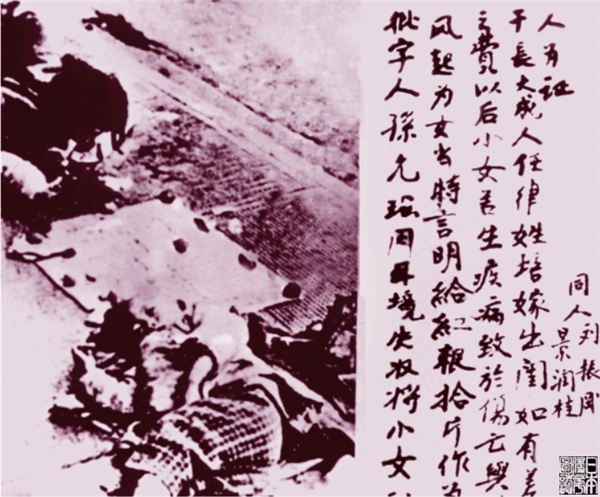 为求生存,农民孙允瑶仅以十斤粮的价钱将女儿卖出。图为其出卖女儿的情景及卖身契。