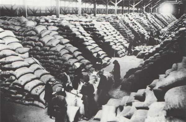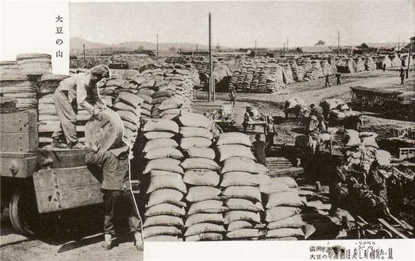 日本占领大连地区后,为了维持其殖民统治和为战争筹措经费,推行殖民统治的税收制度,造成税率高、老百姓负担加重。例如,1905年日本颁布《关东州地区地租规则》,对农户租种的旱田、水田,不分地势优劣、土质好坏都按一个标准收税。(图为:等待外运的东北大豆)
