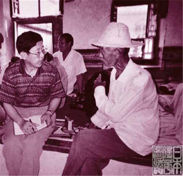 山西榆树辉教村访日军用毒见证人。右一为见证人。