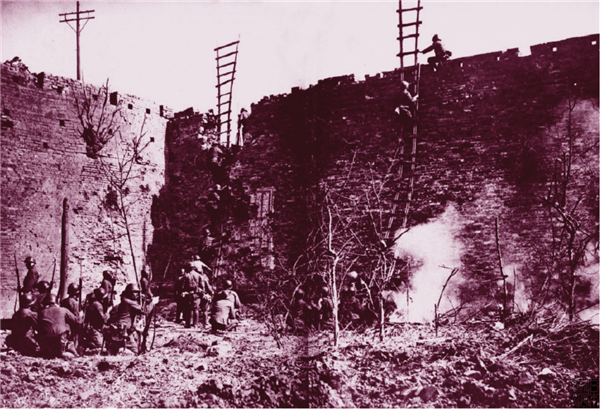 12月2日,日军第十三师团攻占江阴。图为攀登城墙突入江阴城的日军第十三师团官兵。