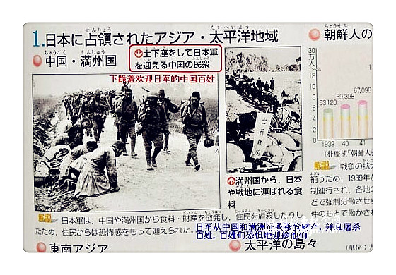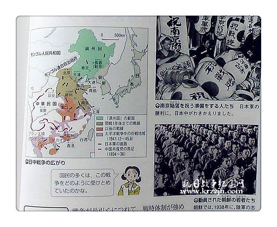 红框内的翻译:战争的扩大,中国,朝鲜和日本的国民是怎样被卷入的?这个事件被称为南京大屠杀遭到了国际社会的非难,但是(当时的)国民却并没有被知道。12
