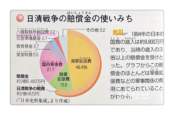 甲午战争签署的条约,清国除了割地,还赔偿日本超过了国家一年收入3倍多的钱,这些钱财大多数被日本用于扩充军备。(编者按:由此可看出国内盛传甲午海战中国赔款都被日本拿去发展教育是谣传。)15