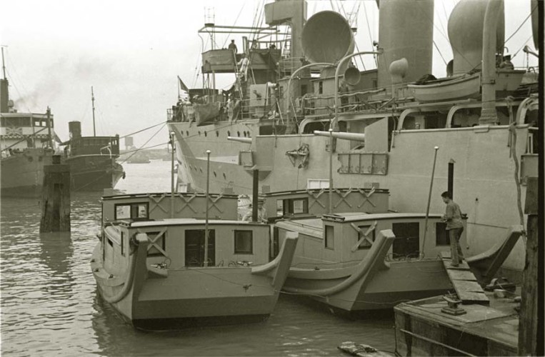 两艘电雷学校的英国制鱼雷快艇并泊于母船旁
