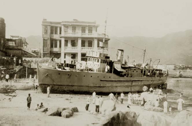 广东海军的“海鶖”号炮舰,这是她1936年8月16日停泊香港期间因为台风搁浅岸上。