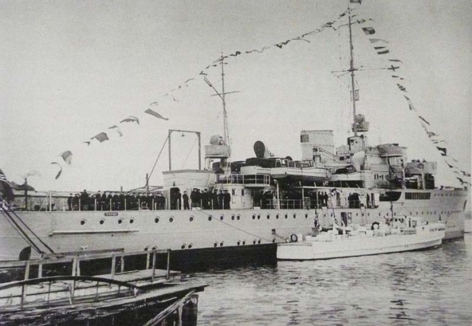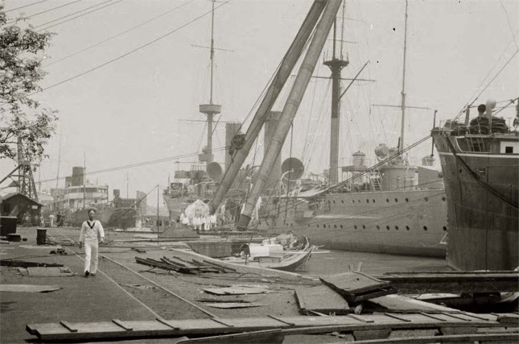 1937年停泊在上海江南造船所码头等待检修的“海容”号巡洋舰,这时已接近她的命的终点。