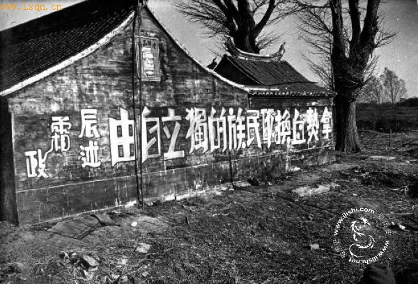 1937年12月日军进攻南京时,成外的抗战标语,“拿热血换取民族的独立自由”,体现了中华民族不屈的精神,广大的国军将士守土保家必死的决心。