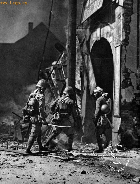 1937年10月,日军在上海闸北战斗中与中国军队进行激烈的巷战,图为一名日军拔出武士刀,杀气腾腾,准备进入屋内搜索抗日份子。