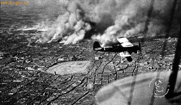 1937年10月,日本军机飞越上海浦东上空,下方冒烟处为遭日军炮火轰炸的闸北地区。