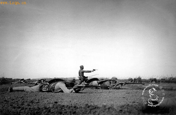 1938年淞沪抗战中,在开阔地与日军对射的我国军士兵,淞沪会战中我国军人作战极其英勇,中日双方都伤亡惨重。