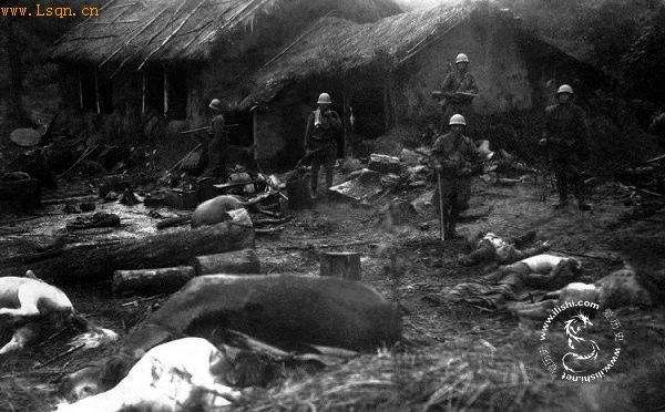 日军在东北为追捕抗日分子,清乡后的场景。