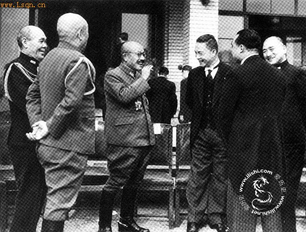 1942年12月,日军扶植的伪南京国民政府主席汪精卫(右三)前往东京,参加“大东亚战争一周年纪念会”。图为汪精卫会见日本首相东条英机(左三)时的情形。
