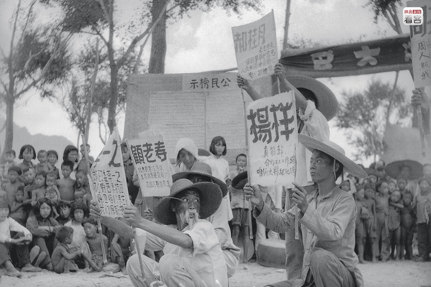1939年7月,河北阜平陈庄,抗大二分校庆祝抗战两周年运动大会上,文工团在广场演出,吸引民众聚集观看。