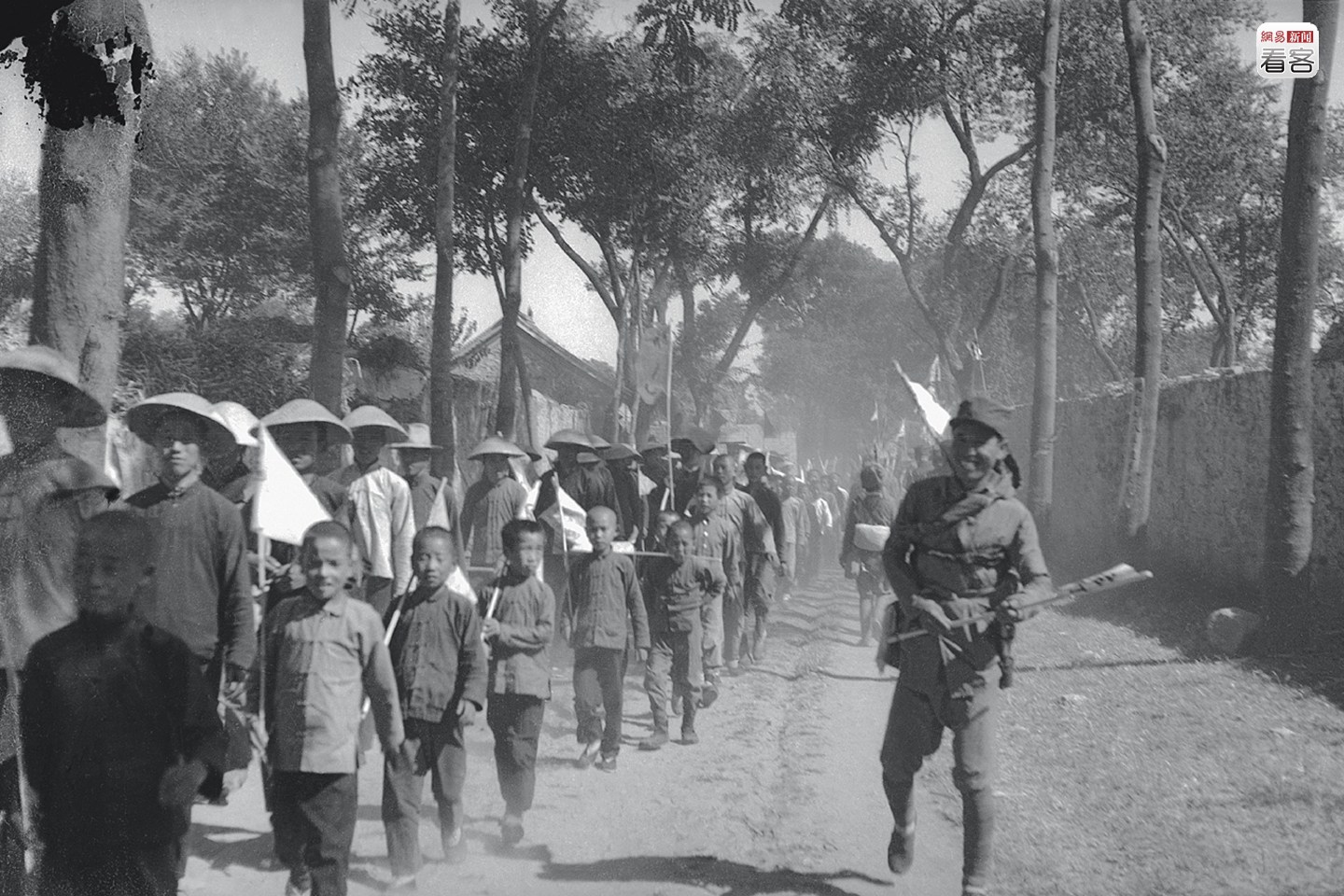 1940年4月4日,河北唐县,“四四儿童节”儿童团检阅大会期间的抗日小兵