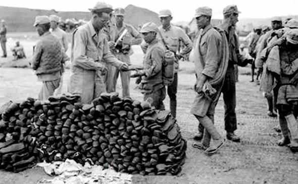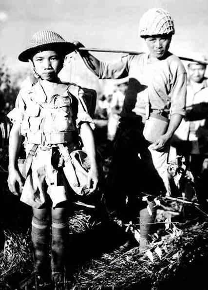 少年兵装备得一贫如洗,短裤虚着边,脚上着草鞋,日本兵全副披挂,皮挎包,皮靴,闪亮的长枪。