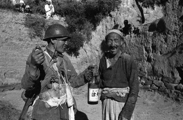 1944年八路军战士轻松一刻,向老乡展示了缴获的日本酒。