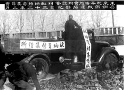 ⑥天津沦陷后,日伪政权为强化其殖民统治,一方面利用其警察署和宪兵队以各种法西斯手段残酷镇压爱国抗日民众,另一方面在天津周边地区实施惨无人道的“三光”政策,制造了60余起灭绝人性的暴行惨案,妄图以此消灭所有抗日反日活动。1941年年底太平洋战争爆发后,日本为维持其对中国及东南亚国家发动的侵略战争,在中国推行“以经济战为主体”,一方面疯狂地从中国掠夺各种战略物资和资源,另一方面在其统治地区成立“圣战献金动员总会”,强迫机关团体、企业、商号和全体市民“献铜、献铁、献金、献锡”,以此弥补其军需资源匮乏。自1941年12月至1944年2月,日伪当局从天津商会、工厂联合会掠得“献机金”125万元,从钱业、五金业公会掠得130万元,从银行业同业公会掠得100万元;搜刮铜60多万公斤,铁41万多公斤,锡纸1.5万张。与此同时,日伪统治当局成立了各种“统制会”,将所有重要工业原料和生活必需品全部管制起来,一方面对抗日实行经济封锁,另一方面对市民实行“配给制”,没有日军的特别许可证谁也休想得到,一旦发现“走私”行为,性命难保。有些重要企业还被日军以军管方式强行霸占。此外,日伪当局还以高压方式大肆推行“治安强化运动”,通过强化“保甲制”“自肃自励”“勤劳俸仕”等各种名目以及强力推行殖民奴化教育,严格控制市民的思想和行为,对违反者,轻者关押刑罚,重者秘密枪决。为大肆掠夺中国的资源,日本在中国滥发纸币和战争债券,导致通货膨胀,据统计,1943年中国物价是抗战前的35倍。在日伪殖民统治下,中国人民饥寒交迫,苦不堪言。图为1943年天津日伪当局所搞“献纳活动”现场。